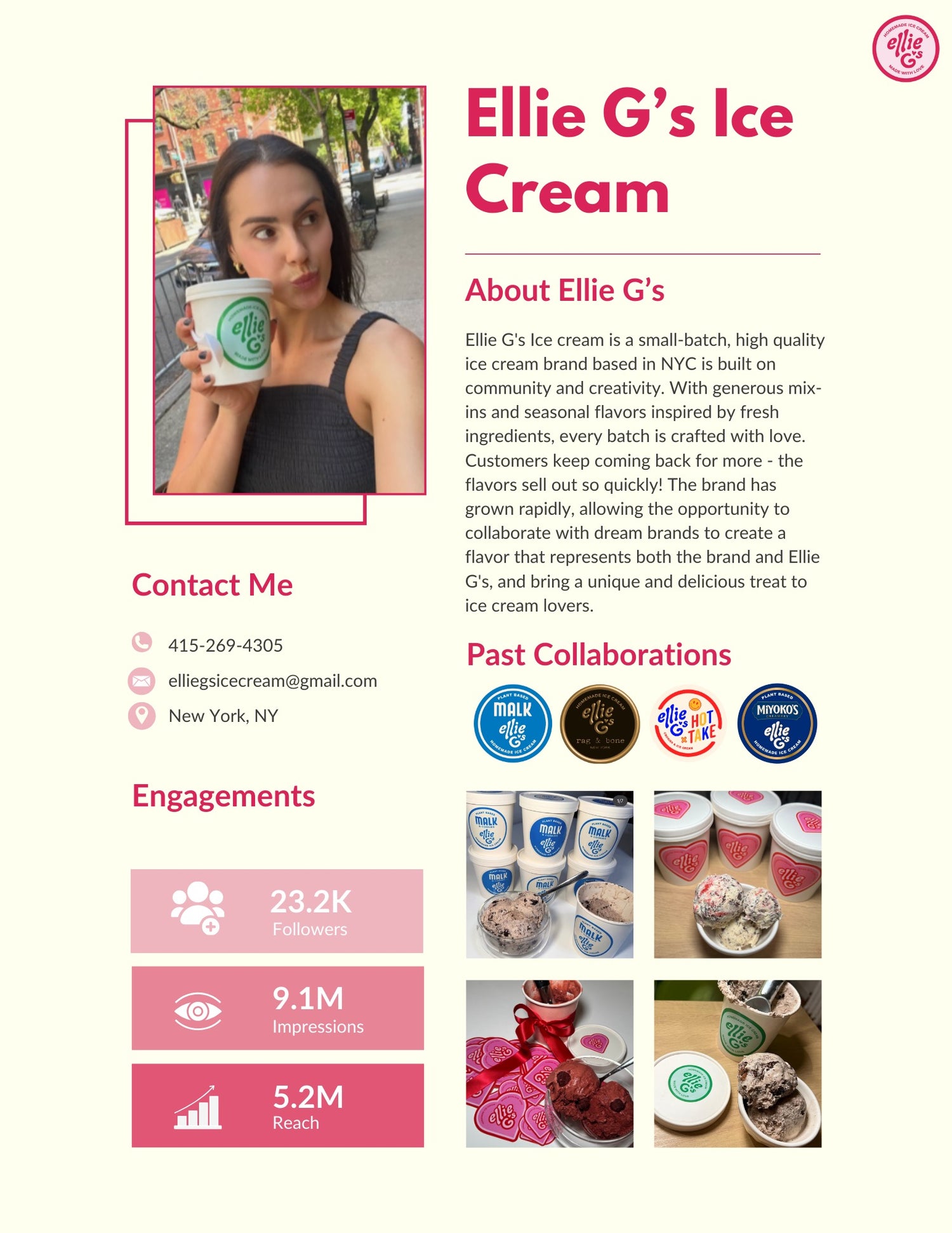 Ellie G’s is all about community, creativity, and of course - delicious homemade ice cream! I love partnering with like-minded brands to create exciting, one of a kind collaborations. Whether it’s a custom flavor, a social media feature, or a special event, let’s make something sweet together! Check out my media kit to learn more, and reach out!